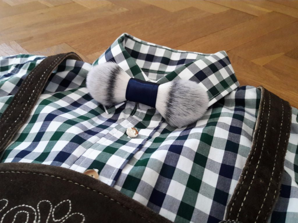 I’m a big fan of bow ties. So why not approach a traditional outfit (tracht and lederhosen) differently and turn a gamsbart into a tracht-themed (and really soft and fluffy) bow tie?